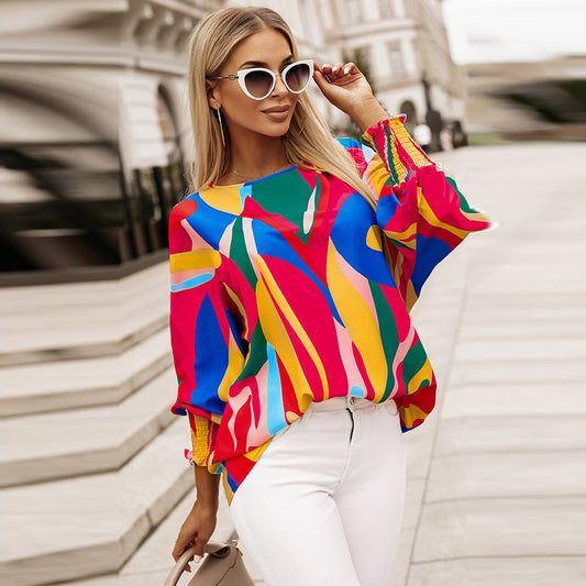 Multi-color Pullover Chiffon Shirt Personalized Abstract Printing Ruffled Long-sleeved Top